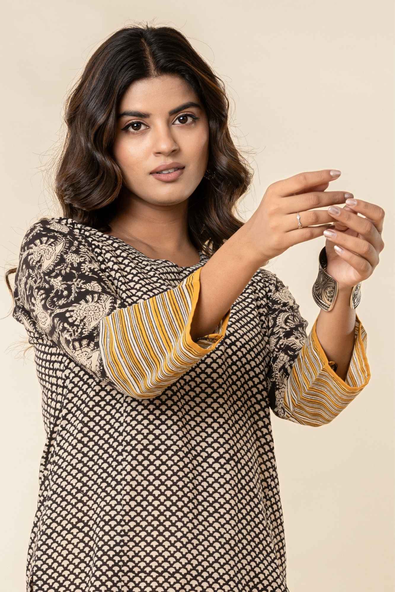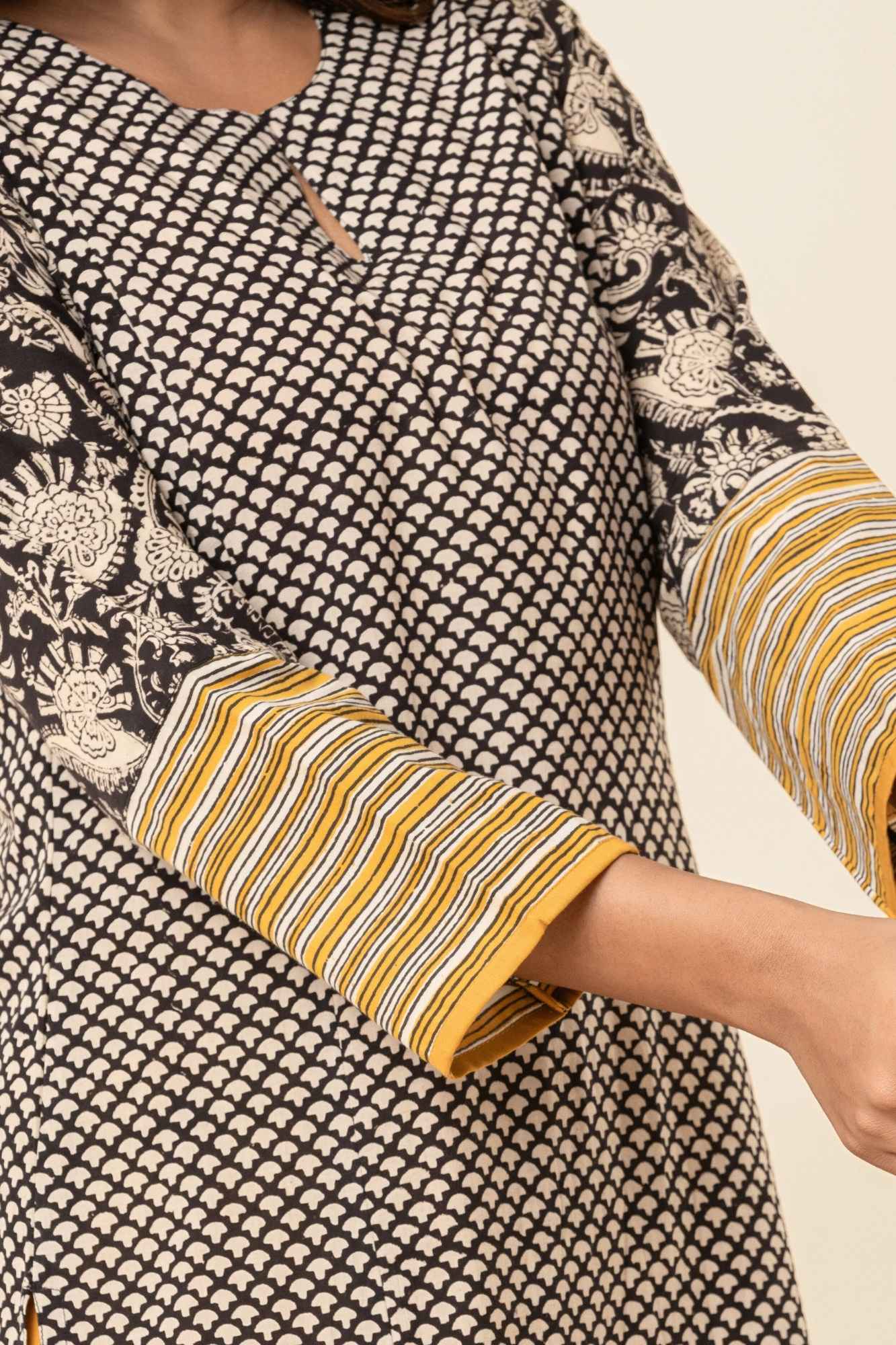 Black Cotton Straight Kurta Set with Patchwork Sleeves (Set of 2)