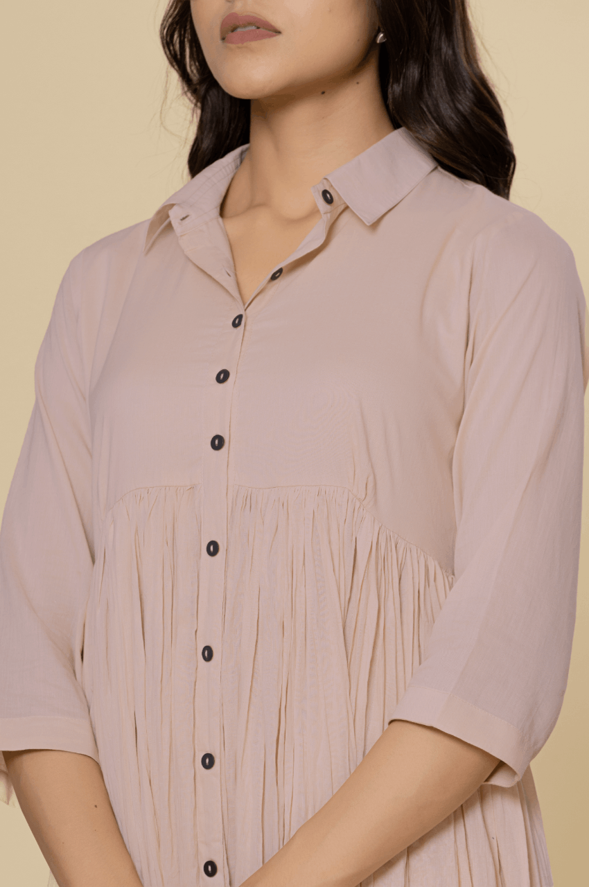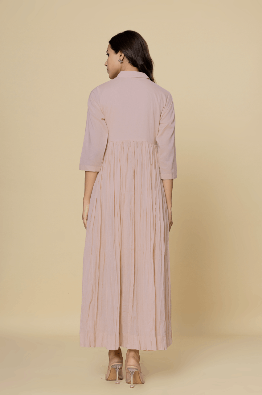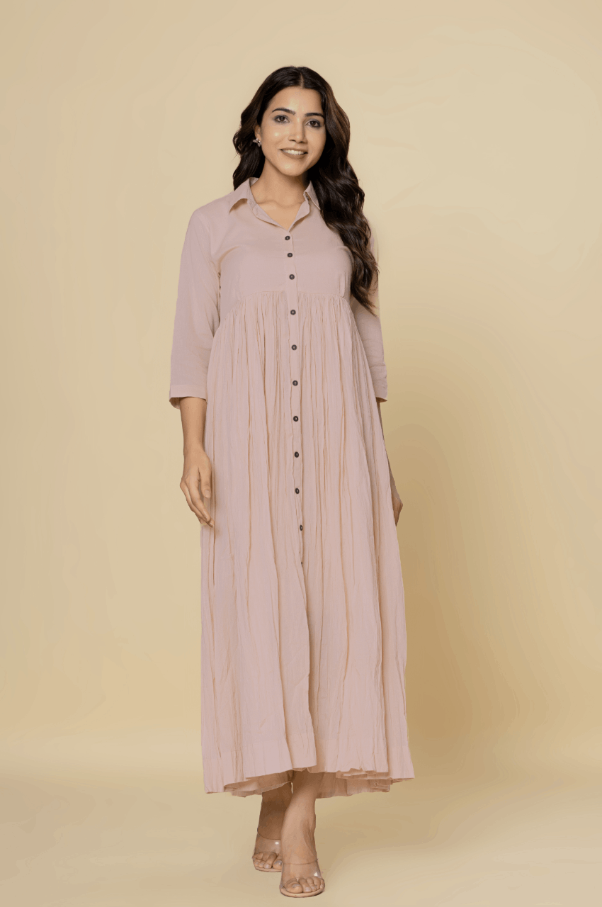 Naksh Dusty Pink Solid Collared Long Gathered Kurta-Dress